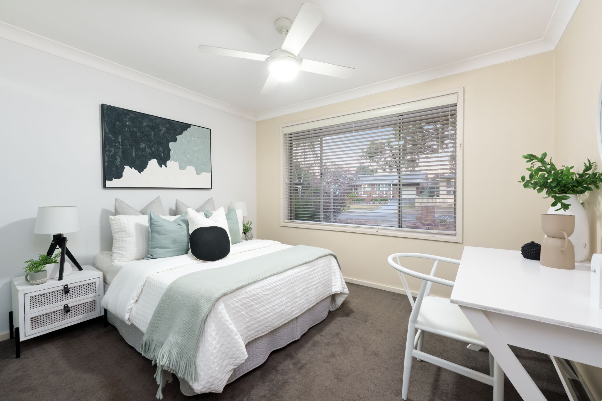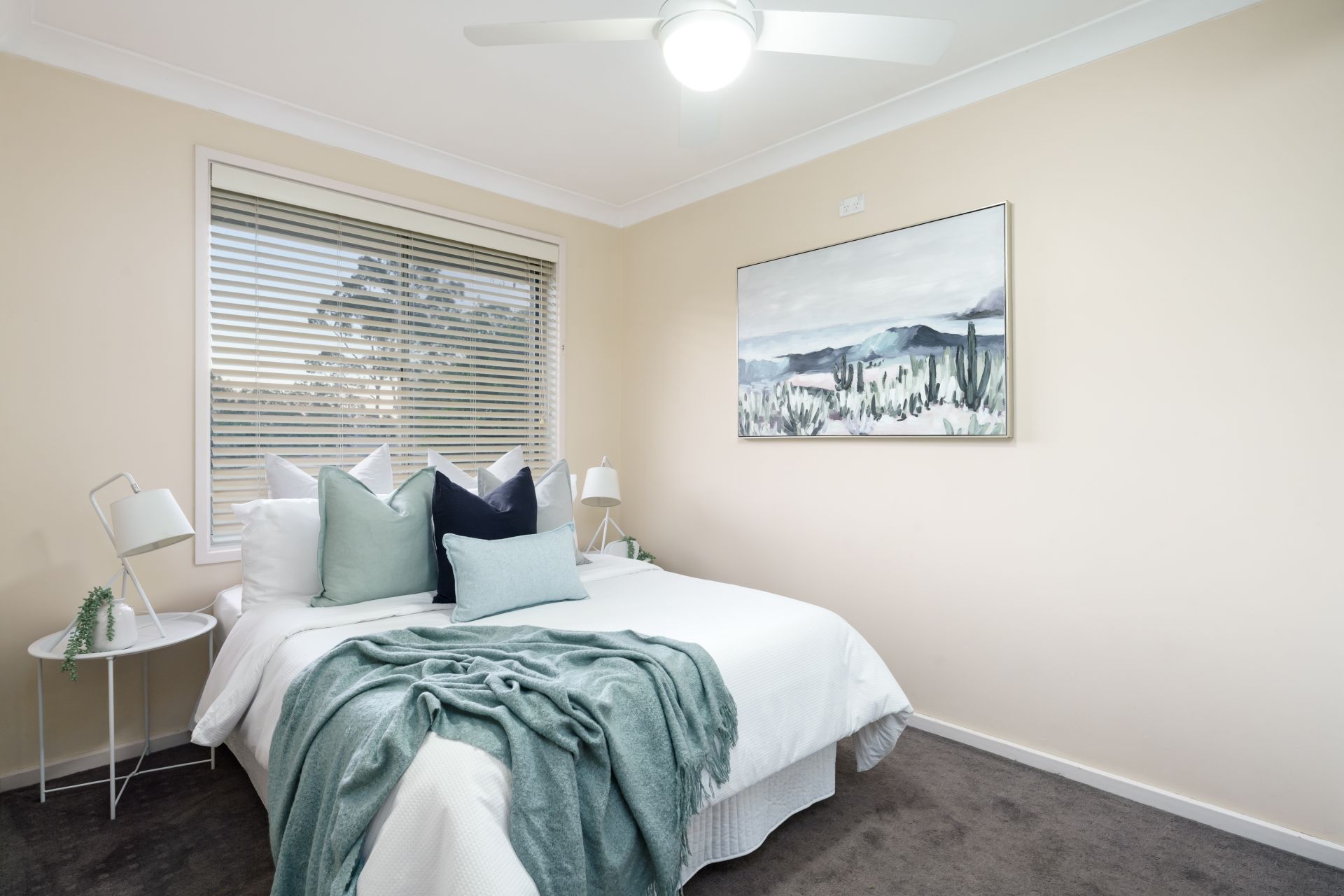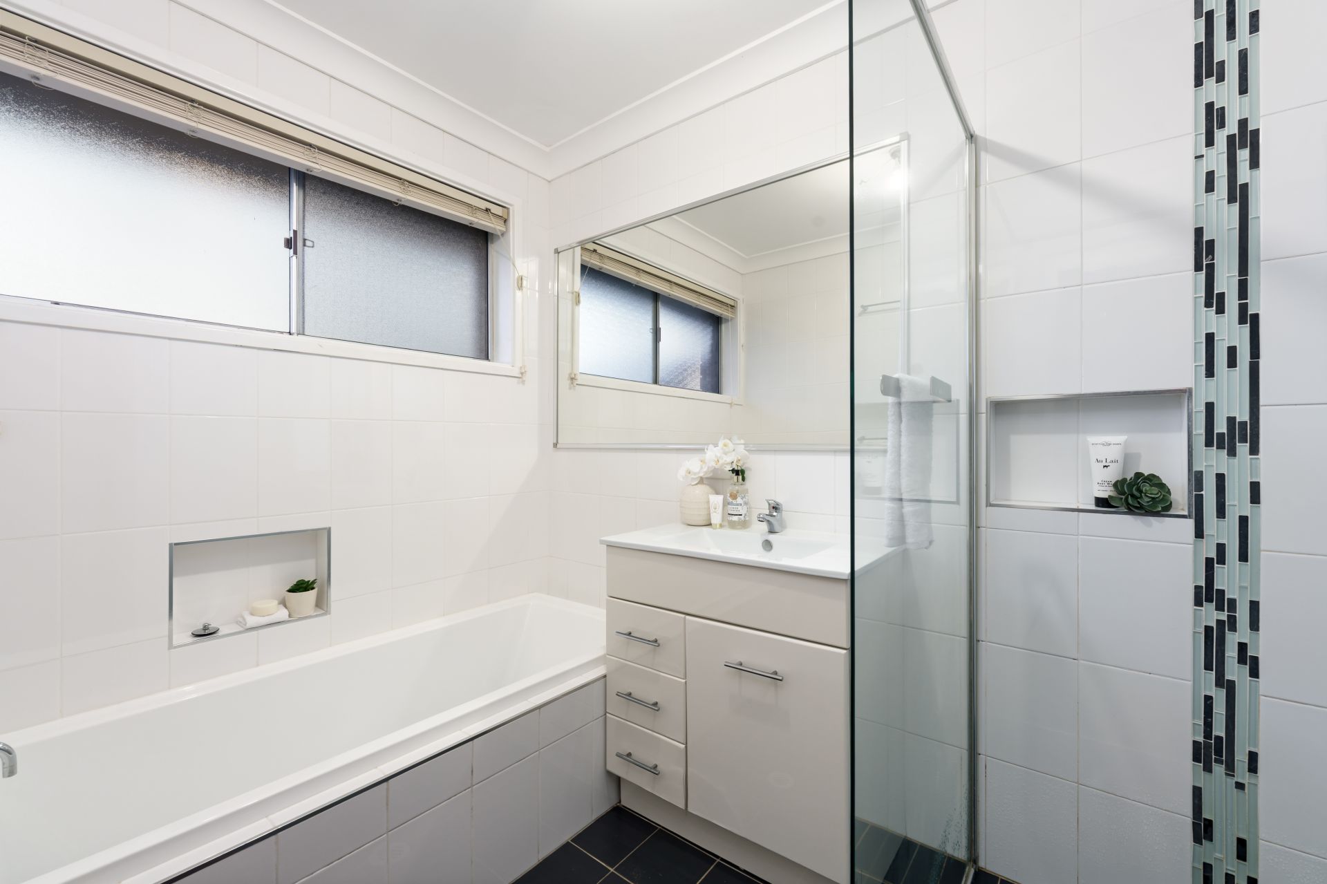 - Three bedrooms with robes and fans; tiled bathroom with shower and tub