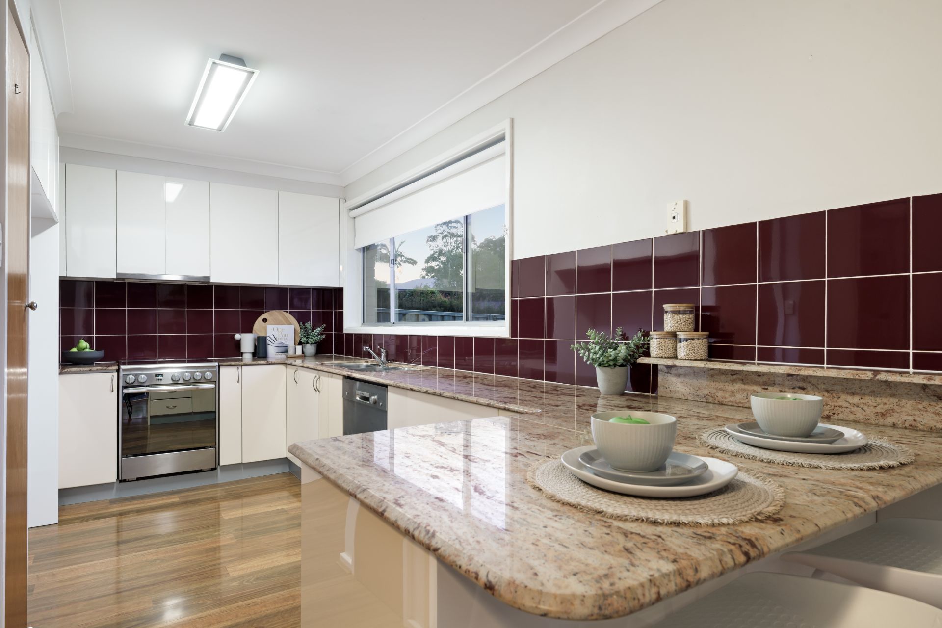 - Stone kitchen benchtops, stainless dishwasher, all-electric cooking