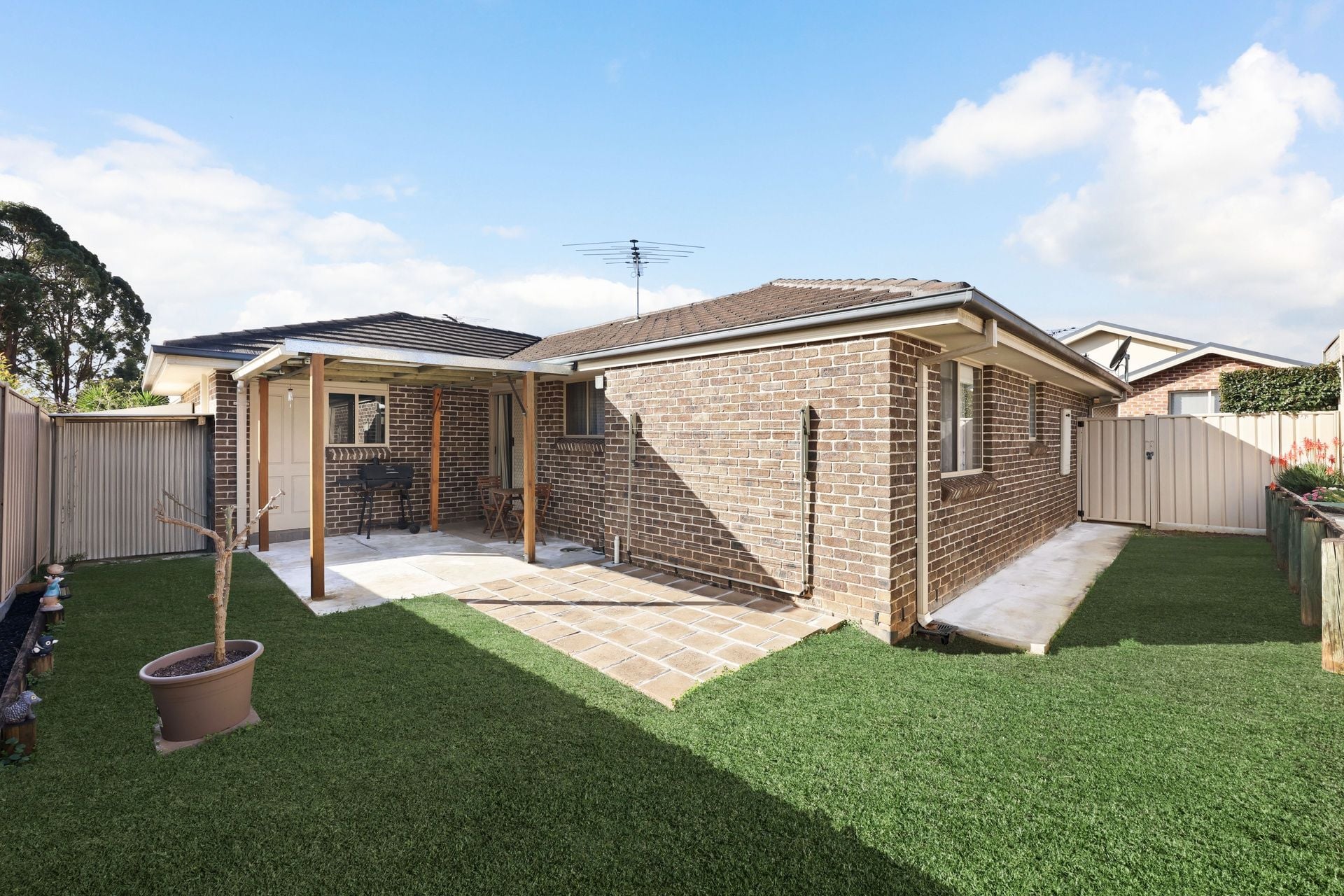 - Outdoors, a low-maintenance backyard with a concrete entertaining area